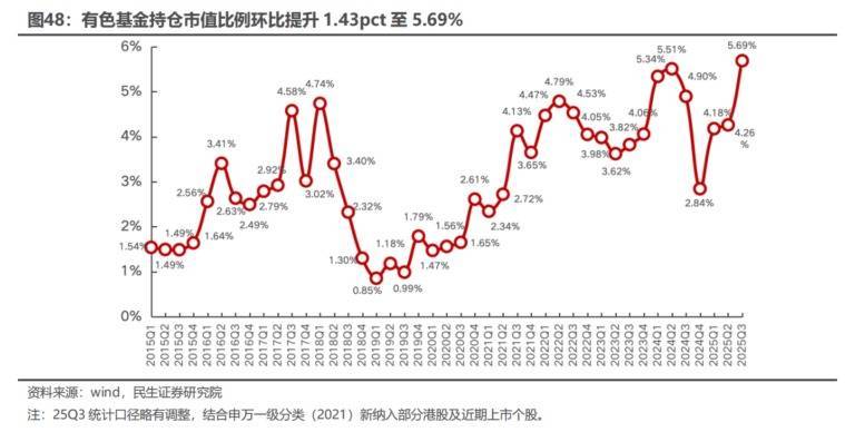 机构投资者的布局行为同样值得关注。根据民生证券统计,2025年第三季度,公募基金对有色金属板块的持仓比例升至5.69%,环比上季度增加1.43%,达到2021年以来新高。
